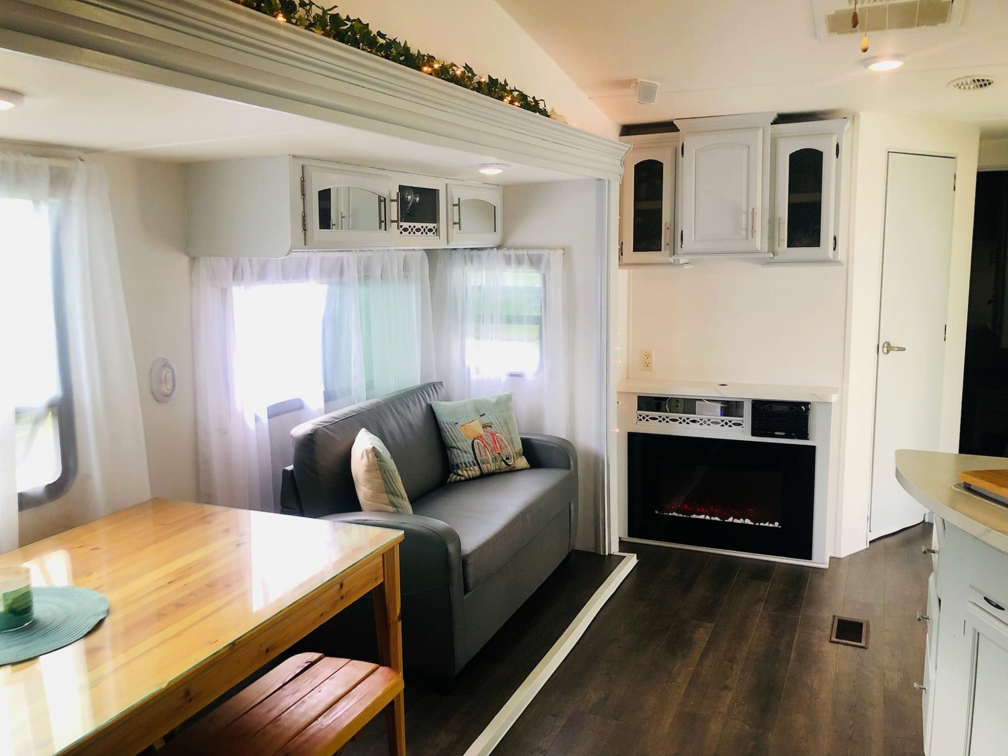 Boasting two queen bedrooms and two full baths, this micro home is more than just a pretty face. Plumbing, water lines, and more have been painstakingly designed to handle the cold temps of the Northeast. In addition, it has been modified to connect to local water, sewer, and electrical systems. Take a walk-thru below.